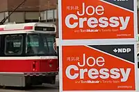 Cressy canvassing with NDP leader Thomas Mulcair (top) and campaign signs on Spadina Avenue (bottom)