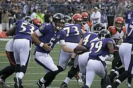 Due to a season-ending injury to incumbent starter Kyle Boller and an illness to former Heisman Trophy winner Troy Smith, Flacco became the starting quarterback in the 2008 season opener against the Cincinnati Bengals. He completed 15 of 29 passes for 129 yards, his longest pass being a 15-yard play to Derrick Mason. He threw no touchdowns and no interceptions in his debut, but he had a 38-yard rushing touchdown,[27] which was the longest rushing touchdown by a quarterback in Ravens' franchise history at the time (the record has since been broken several times by Lamar Jackson). Flacco's touchdown put the Ravens up by 17–3; the team eventually won the game 17–10.[28]