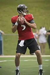 At Delaware, Flacco was pessimistic about his chances to play in the NFL, and after his junior year asked his coach for permission to play baseball. The coach predicted that he would be selected in the NFL Draft, surprising Flacco.[21] With a solid showing at the Senior Bowl and NFL Combine, Flacco solidified himself as a top five quarterback in the 2008 NFL Draft.[22] Flacco won the long distance throw competition in ESPN's State Farm College Football All-Star Challenge with a 74-yard throw, beating out Matt Ryan, Colt Brennan, Chad Henne, and John David Booty, later winning the Taco Bell Quarterback Scramble with a time of 15.72 seconds.[23]