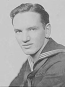![]() Joe Gill in sailor's uniform, 1940s on board the USS Cavalier APA 37 | |