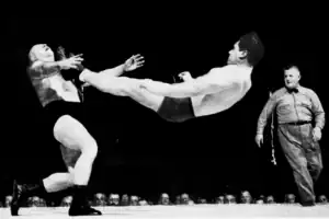 - Image of wrestling match between Joseph “Jumping Joe” Savoldi and Mayes McLain, Olympic Auditorium, Los Angeles, 1935. Los Angeles Times Photographic Archive (Collection 1429). UCLA Library Special Collections, Charles E. Young Research Library, University of California, Los Angeles.