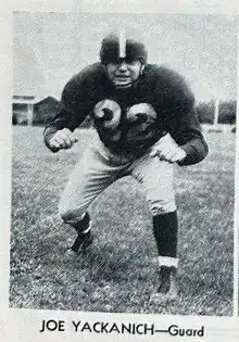 Yackanich was selected by the Cleveland Rams in the 20th round of the 1944 NFL Draft while he was still in the Army. Yackanich left the Yankees during the 1948 season to finish his degree at Fordham.[2] He played in 26 games over three seasons with the Yankees.[3] After graduating he was hired by the Rams to coach the freshman football team and later became and offensive line coach for the Rams.[4]