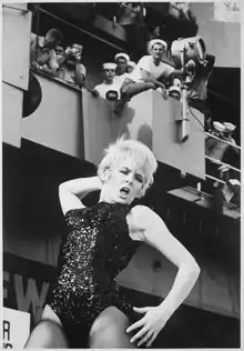 Beginning in the mid-1960s, Heatherton began to gain attention for her sensual dancing on television, which some viewers considered shocking and some critics derided as "sleazy eroticism".[5][6] In 1964 she appeared on The Tonight Show, where she coached Johnny Carson on the finer points of dancing "The Frug". She received major publicity following her guest appearance on the January 1965 premiere episode of the teen dance show Hullabaloo.[6][12] She was featured on several more episodes of the show and released "Hullabaloo", a song that she had performed on the show, on Coral Records. At the invitation of Dean Martin, Heatherton also appeared extensively on The Dean Martin Show starting with the premiere episode of September 16, 1965. She was a mystery guest on the game show What's My Line? on November 7, 1965, the last show on which Dorothy Kilgallen appeared.[13]