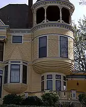 The house was built in 1891. The turret reaches approximately 50 feet.[3] It includes a bedroom on the first floor for a servant. It contains two lead glass Oriel windows, a Palladian window, curved glass in the turret, and beveled lead glass windows.[4][5] The home also contains a veranda, added around 1915.[5] It is considered a "Pacific Northwest interpretation of the Queen Anne Style", since it does not contain stone or brick.[4]