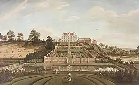 During his stay in England he also painted a scene of A Dutch Mansion with Garden, signed and dated 1730. It is not clear whether the painting represents a specific mansion (some have suggested Huis Rijswijk in Gelderland in the Dutch Republic) or perhaps an ideal, imaginary house.[6]