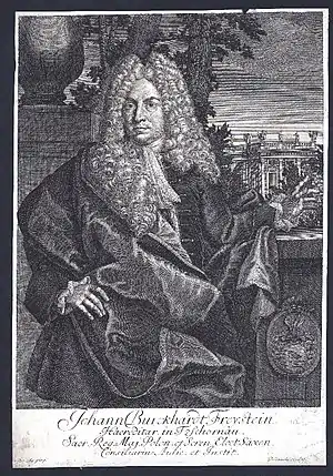Johann Burchard Freyenstein studied at the University of Leipzig in law, mathematics, philosophy and architecture. He spent some time in Berlin and Halle. In 1695 he achieved his doctorate in law at the University of Jena. He then founded his own firm in Dresden. In 1703 he was counsellor in Gotha. In 1709, he returned as a counsellor of court and law in Dresden, where he died.