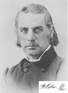 Johann Konrad Wilhelm Löhe (21 February 1808 – 2 January 1872) (often rendered 'Loehe') was a pastor of the Lutheran Church, Confesional Lutheran writer, and is often regarded as being a founder of the deaconess movement in Lutheranism and a founding sponsor of the Lutheran Church–Missouri Synod (LCMS). From the small town of Neuendettelsau, he sent pastors to North America, Australia, New Guinea, Brazil, and Ukraine. His work for a clear confessional basis within the Bavarian church sometimes led to conflict with the ecclesiastical bureaucracy. His chief concern was that a parish find its life in the eucharist, and from that source evangelism and social ministries would flow. Many Lutheran congregations in Michigan, Ohio, and Iowa were either founded or influenced by missionaries sent by Löhe. He is commemorated on 2 January by the calendars of both the LCMS and the Evangelical Lutheran Church in America.