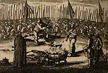 The circumstances of Patkul's death were documented first by chaplain Loren(t)z Hagen, who accompanied Patkul in his last two days, in his 1707 book titled Das schmertzliche doch seelige Ende, Des Welt-Bekandten Joh. Reinhold Patkuls[1] (English translation in 1761 under the title Anecdotes concerning the famous John Reinhold Patkul[2]). Another account of Patkul's execution is a 1708 leaflet of unknown origin titled Kurtze Beschreibung der merck- und denckwürdigen Execution Des tapffern und Welt-bekanten General Patkuls, Wie selbiger den 10. October. 1707. zu Casimir in Pohlen erbärmlich hingerichtet worden [in English: Short description of the notable and memorable execution of the brave and world-famous general Patkul, how the same on 10 October 1707 in Casimir in Poland was executed miserably].[3] Differing slightly, the accounts agree that Patkul, after a prolonged process of breaking his bones with the wheel, begged for his decapitation (crying "Kopf ab!") and rolled to the block on his own; the following decapitation did however not succeed until after several strikes.