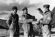 Schalk was the first member of the Luftwaffe to receive the Honour Goblet of the Luftwaffe (Ehrenpokal der Luftwaffe).[7] He was also one of the first Zerstörer (destroyer) pilot to receive the Knight's Cross of the Iron Cross (Ritterkreuz des Eisernen Kreuzes) on 11 September 1940 after nine aerial victories.[3] The other two Zerstörer pilots who had received the Knight's Cross in September 1940 were Joachim-Friedrich Huth and Walter Grabmann.[8]