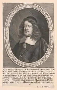 Johann Weikhard held several positions at the Austrian court. From 1640, he was Obersthofmeister (Lord Chamberlain) and teacher of Ferdinand IV, who was King of the Romans at the time. In 1641 he was sent to The Hague and later he took part in peace negotiations at Osnabrück, which ultimately ended the Thirty Years’ War with the Peace of Westphalia (1648).[2] In 1653, Emperor Ferdinand III raised him to Imperial Prince and in 1654, in his capacity as King of Bohemia, enfeofed him with the Duchy of Münsterberg and the City of Frankenstein. He then styled himself Duke of Münsterberg.[3]
