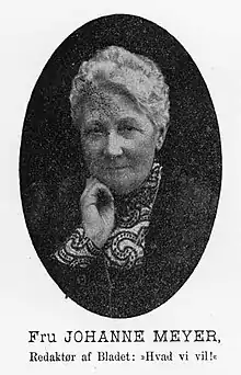 Johanne Marie Abrahammine Meyer née Petersen (1838–1915) was a Danish suffragist, pacifist and journal editor. A pioneering member of various women's societies, from 1889 she served on the board of the pacifist organization Dansk Fredsforening and became the influential president of the progressive suffragist organization Kvindelig Fremskridtsforening (KF). From 1888, Meyer was editor of KF's journal Hvad vi vil (What We Want), to which she contributed many articles.[1][2]