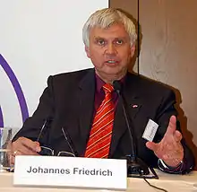 Friedrich studied theology at the University of Erlangen-Nuremberg and at the University of Tübingen,[1] was reverend in Nuremberg, campus minister at the University of Erlangen-Nuremberg and German Lutheran Provost at Redeemer Church in Jerusalem.[2] He is a member of the EKD Council of the Protestant Church in Germany,[3] since 1999 Landesbischof (bishop) of the Evangelical Lutheran Church in Bavaria[4] and from 2005 leading bishop of the United Evangelical Lutheran Church of Germany.[5] Friedrich worked on a Lutheran/Catholic Joint Declaration on the Doctrine of Justification (JD)[6] and supports the Christian–Islamic dialogue in order to cause the Christian–Islamic understanding.[7][8]