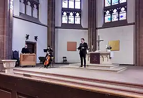 On 26 October 2019, he was the bass soloist in Dvořák's Stabat Mater in a concert with the Chor von St. Bonifatius, members of the orchestra of the Hessisches Staatstheater Wiesbaden, conducted by Roman Twardy. A reviewer singled him out among the soloists and noted the mellow timbre of his voice, carrying effortlessly ("der mühelos tragfähige, warm und weich timbrierte Bass ...").[15] Hill has been a regular soloist in cantata services at the Dreikönigskirche, Frankfurt, which were continued with solo cantatas during the COVID-19 pandemic, including a service during Lent with Telemann's cantata Ich will den Kreuzweg gerne gehen, composed for bass, violin and continuo.[16]