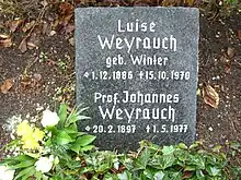 The care of his wife, who was already almost blind and in need of care, did not allow Weyrauch to devote himself to composing. The years of care now also led to states of exhaustion and vegetative complaints. At the beginning of 1970 he was admitted to a hospital in Leipzig, but recovered again. On 15 October 1970 his wife Luise died, which is why he only composed a little. In 1972 he moved to a retirement home. After his 80th birthday in 1977, a rapid decline of his physical and mental powers began. Weyrauch died on 1 May 1977 at the age of 80 and was buried at Gundorf Cemetery (near Leipzig).