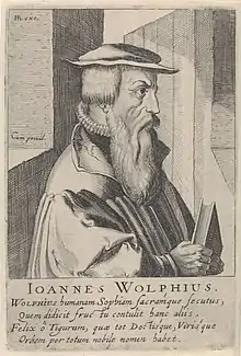 Johannes Wolf was born in Zurich in the year 1521. He became the chaplain of the Zurich hospital in 1544. He received a ministerial position of at the Fraumünster in 1551. In 1565 he became theology professor at the Carolinum in Zürich, also known as the Zurich Academy or Lectorium. He died in 1572.[1][2]