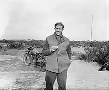 Le Roux standing in front of his motorcycle at Souk el Khemis ('Waterloo'), Tunisia