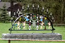 Germany's first ski jump was built in 1929 near Johanngeorgenstadt. It bore the name “Hans-Heinz-Schanze”. In 1934, the formerly abandoned mining industry was taken up again. In the Second World War, with the seizure of owner Arthur Krautmann's “Deutsches Haus” hotel across from the railway station, the town became home to a military hospital. Furthermore, the town harboured a subcamp of the Flossenbürg concentration camp[3] in which countless inmates died. Its prisoners were used as forced labour and were deported mostly from German-occupied Soviet Union, Poland and France.[4] The Johanngeorgenstadt camp was emptied on 13 April 1945 and the inmates were sent on a death march towards Theresienstadt.