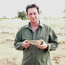 His work on the international fossil trade, which highlighted problems of fossil smuggling and ignorance of legislation, was made into a 2-part documentary series entitled The Dinosaur Dealers, and published as a book of the same name. He has been active in Australia since the late 1990s dealing with issues of fossil repatriation, legislation and heritage. His books for children include two novels based on cutting-edge research that paint vivid pictures of travelling back in time to experience the varied landscapes of prehistoric Australia (Mystery of Devils Roost, Journey to the Dawn of Time)[30][31] as well as non-fiction works dealing mainly with dinosaurs[32] and prehistory, but also with the environment and climate change[33] and the development of human civilizations.[34]