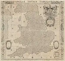 Aware that he had needed to omit a great many places shown on Saxton's and Norden's county maps, Adams began to compile a list of them, and engaged King to supplement this list by extracting place-names from the recently-collected records of the Hearth Tax surveyors.[11] The resulting Index Villaris, or an Alphabetical Table of all Cities, Market-towns, Parishes, Villages, Private Seats in England and Wales, published in 1680, contains no fewer than 24,000 entries detailing key information about each place; the publication included a copy of the reduced 1679 map. In the Preface, Adams described how, before coming to London, he had tabulated the distances between market towns in north Wales in order to calculate the potential market for fish landed at Aberdovey; on his arrival in London and recognising the economic value of such distance tables he had extended them across the whole of England and Wales. The inclusion of geographical coordinates for every place, calculated by triangulating the distances between places reported by his correspondents and between points indicated on earlier maps (taking as a basis the coordinates of county towns published by Speed),[12] is testament to Adams' vision and tenacity.[note 5] Index Villaris was so successful that it was reprinted in 1690 and again in 1700,[note 6] and numerous copies remain in the local collections of the National Trust.[14]