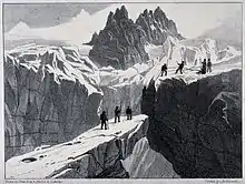 In 1822, Auldjo entered Trinity College, Cambridge. Before he embarked on his Grand Tour, he secured a place at Lincoln's Inn, London.[1] In 1827, during the early stages of his tour, he decided to climb to the top of Mont Blanc, going with six guides. At the summit he shared a bottle of wine with the guides and then sat down to write a short letter to his sister. The letter, still preserved today and signed on the back by all six guides, is one of the most evocative items in the Archives of the Alpine Club.[2] Auldjo's 1828 written account of the ascent, with his own illustrations, was a success and ran to three editions.
