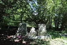 The gravestones of John B. Bachelder, his daughter Charlotte, and his wife, Elizabeth.