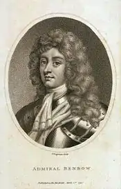 Vice-Admiral John Benbow (10 March 1653 – 4 November 1702) was an English officer in the Royal Navy. He joined the navy aged 25 years, seeing action against Algerian pirates before leaving and joining the merchant navy in which he traded until the Glorious Revolution of 1688, whereupon he returned to the Royal Navy and was commissioned.