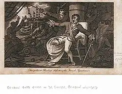 Benbow's experience led to him being promoted to a similar flotilla, this time to be deployed against Dunkirk under the command of Vice-Admiral Shovell. A number of converted merchant vessels, rigged like fireships but designed to explode rather than burn, were assigned to support the expedition.[9] Benbow had a hand in preparing these vessels for the operation throughout 1694, and worked closely with the principal storekeeper of the ordnance, Willem Meesters.[26][27] Benbow's attacking fleet was covered by Shovell's fleet on the Downs and the attack was planned for 12 and 13 September.[27] However, the French were able to block the entrance to the port, preventing Benbow's squadron from entering, and a storm further disrupted operations.[27] Benbow drew back from Dunkirk, and instead sailed around to Calais, where he carried out a further bombardment on 27 September. He returned to the Downs and then resumed his duties at Deptford Dockyard. He spent December organising a convoy for a fleet of merchant vessels due to sail to Cadiz.[20]