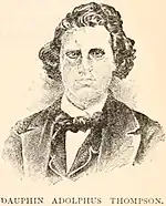 † Dauphin Thompson, 21, married to Ruth Brown, John Brown's daughter, mortally wounded during the raid[36] From North Elba, New York, he was killed in the storming of the engine house. He was brother of William. First buried in one of two unmarked boxes near Harpers Ferry; re-interred in 1899 in a common coffin in North Elba.