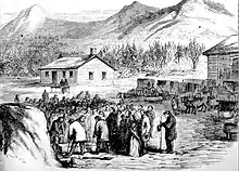 Contrary to Brown's wish,[35][36][37] none of his family would remain long at the North Elba farm. In 1860 his three oldest sons, John Jr, Jason, and Owen, were all living in Ohio. Salmon, who later remarked that the Brown family was "despised bitterly" and “our family was long buffeted from pillar to post,” also departed, in his case for California.[38] He was accompanied by his wife, children, mother Mary Brown, and sisters Sarah and Ellen, Mary seeking "a chance to start over in a 'new country".[39]: 19 In 1863 Mary leased the farm to Alexis Hinckley, brother of Salmon's wife. In 1865 he purchased it from her, the grave site being exempted, for $800 (~$15,294 in 2022).[40][41] It was with the proviso, added to the deed, that any interested party should be allowed to cross the property to access her husband's grave.[42] Registers were kept so that visitors could write their name and any comments; Joshua Young left remarks in 1866.[43]