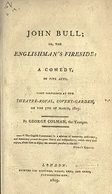 John Bull is an 1803 comedy play by the British writer George Colman the Younger. It premiered at the Theatre Royal, Covent Garden on 5 March 1803.[1] The original cast included George Frederick Cooke as Peregrine, Henry Erskine Johnston as Frank Rochdale, Charles Klanert as Williams, John Waddy as Lord Fitz-Balaam, William Thomas Lewis as Honourable Tom Shuffleton, John Henry Johnstone as Dennis Brulgruddery, John Fawcett as Job Thornberry, George Davenport as Mr Pennyman, John Emery as Dan, Nannette Johnston as Lady Caroline Braymore, Mary Ann Davenport as Mrs Bulgruddery and Maria Gibbs as Mary Thornberry. The prologue was written by Thomas Dibdin. Its Irish premiere was at Dublin's Crow Street Theatre on 18 May 1803.[2]