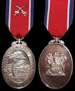 The John Chard Decoration, post-nominal letters JCD, was a military long service decoration which was instituted by the Union of South Africa on 6 April 1952. It was awarded to members of the Citizen Force of the South African Defence Force for twenty years of efficient service and good conduct. Clasps could be awarded after thirty and forty years service respectively.[1][2][3]
