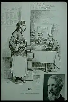 In Nast's cartoon "A Matter of Taste", published March 15, 1879 (seen at right), John Confucius expresses disapproval of Senator James G. Blaine for his support of the Chinese Exclusion Act. Blaine is shown dining in "Kearney's Senatorial Restaurant"—a reference to Denis Kearney, the leader of a violent anti-Chinese movement in California. John Confucius asks, "How can Christians stomach such diet?"