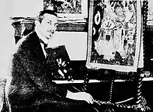 Born in 1915 in New York City on Staten Island, John Dehner was the middle child of three children of Ella Susana (née Dehner) and Ralph LeRoy Forkum.[2][lower-alpha 1] John's father was an accomplished artist who was widely recognized in the United States as a landscape painter, illustrator, and a specialist in painting "highly realistic" backgrounds for stage productions and later for animated features and shorts.[3][lower-alpha 2] John's mother was a gifted musician with artistic talents as well.[4] Prior to the 1920s, Ella Forkum even collaborated with her husband on art projects and in some instances was co-credited for helping him to compose content for his drawings and paintings widely used in newspaper and magazine advertising. One example is a full-page advertisement in the March 18, 1917, issue of the Washington, D.C. newspaper Evening Star.[5] That ad is for Djer-Kiss, a very exclusive line of French perfumes and soaps. It depicts a highly stylized, fairytale-like scene of young women bathing beneath a waterfall. The artwork itself bears the attribution to both of John's parents, to "R.L. + E.D. Forkum".[5]