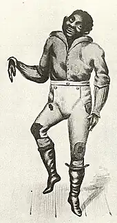 Diamond's repertoire was a mixture of African American, English, and Irish steps.[3] He danced the "five mile out of town dance", the "Long Island breakdown", the "Negro camptown hornpipe", the "ole Virginna breakdown", and the "smokehouse dance". A playbill claimed that his "rattle snake jig" had 120 steps.[18] The steps and maneuvers that made up these dances had equally colorful names; his hornpipe featured the "double shuffle", the "heel and toe", the "pigeon wing", and "running on his heels".[3] His energetic breakdowns were among his more famous dances.[19] Diamond performed in blackface, but some of his dances were strictly British or Irish in origin and were danced without makeup. Examples of these were an Irish jig called the "fireman's hornpipe" and the "naval hornpipe in the character of a Yankee sailor".[20]
