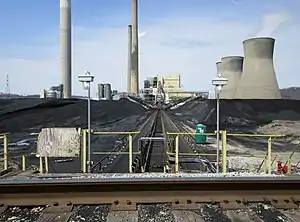 The plant is located between West Virginia Route 817 (Winfield Road) and the Kanawha River. Coal is delivered to the facility by barge or rail, after which it is stored in the plant's coal yard. The coal yard storage capacity can reach up to 1.75 million tons of coal, while the entire plant consumes an average of 26,000 tons of coal daily at full capacity.[4] The coal is then transported via conveyor belt from the coal yard into the plant, where it is pulverized into a fine, talcum powder-like consistency. Primary fans then blow the ground up coal into boilers where it burns at 1,000 °F (538 °C) to turn water into steam. That steam gets sent into turbines, where it turns blades. These blades act like a windmill and drive a generator that produces electricity at 26,000 volts. Transformers outside the plant step up the voltage to 345,000 volts and 765,000 volts.[4]