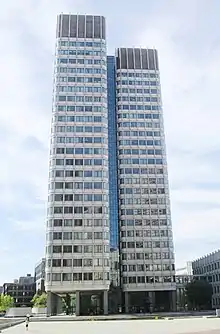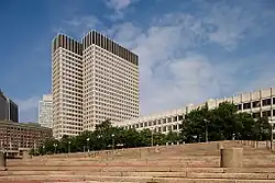 John Fitzgerald Kennedy Federal Building is a United States federal government office building located in the Government Center area of Boston, Massachusetts, adjacent to City Hall Plaza and diagonally across from Boston City Hall. An example of 1960s modern architecture, and designed by Walter Gropius and The Architects Collaborative with Samuel Glaser, it is a complex that consists of two offset 26-floor towers that sit on-axis to each other and a low rise building of four floors that connects to the two towers through an enclosed glass corridor.[1] The two towers stand at a height of 387 feet (118 m).[2] The complex was built in 1963-1966.[1] It was listed on the National Register of Historic Places in 2021.[3]