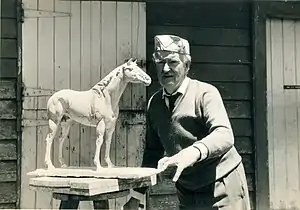 Another commission in 1940 was for the Catholic Hospital, Lambeth Road, London. This is a nine foot high limestone statue of Our Lady of Consolation which stood above the entrance to the hospital,[30] so taking foreshortening into consideration. A bronze model, "Madonna and Child", was exhibited at the Royal Academy in 1944. The hospital closed in 1984[31] and the statue is now outside Our Lady Queen of Heaven Church in Frimley, Surrey.[2] His "Greyhound" (1940) was commissioned by two London bookmakers at the Greyhound Racing Association and was cast in silver.[32]