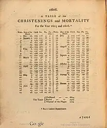 - ↑ Graunt, John; Wilcox, W (1939). Natural and political observations made upon the bills of mortality. Baltimore: The Johns Hopkins Press.