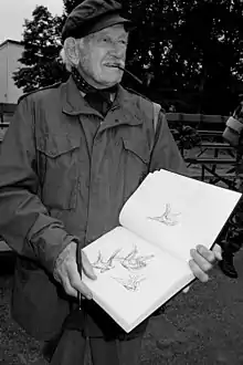 Groth began sketching intently during the Great Depression after studying at the Art Institute of Chicago. Following the advice of an editor, he penned 100 sketches a day for years. He learned to increase his speed by listening to sports on the radio and sketching the action as fast as he could. "I would listen to the games on the radio at night, and sketch the plays. It made me very quick."[5] His break came when Arnold Gingrich, an editor for Esquire magazine, approached him at an art show in Chicago and offered him a position. "The way (Arnold Gingrich) told it," Groth says, "he found this barefoot, bearded kid in the park, and the next day made him art director of the world's leading men's fashion magazine. But I swear I was wearing shoes."[5] Groth went on to work as a correspondent and illustrator for the Chicago Sun, Collier's, Sports Illustrated, and The Saturday Evening Post.