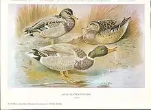 Millais is one of the most respected of British ornithologists and bird artists,[14] producing between 1890 and 1914 a series of books on birds and other natural history subjects. In the study of ornithology he was renowned for his portraiture of wildfowl and game birds, the subjects of his three most famous works: Natural History of British Feeding Ducks;[15] British Diving Ducks[16] and British Game Birds.[17] They rank amongst the finest work on wildfowl ever published. Each bird receives individual treatment in text and detailed chromolithographs, some of which are by his friend and pre-eminent bird artist of the day Archibald Thorburn (1860–1935). Each species is represented by two or three individuals on a plate drawn in attitudes of feeding, resting and courtship.