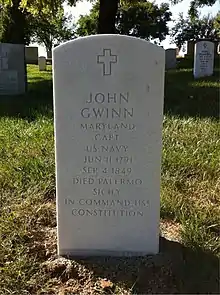 As Captain of USS Constitution, Gwinn sailed on December 9, 1848 and arrived at Tripoli on January 19, 1849. While transporting U.S. ambassador Daniel Smith McCauley and his family to Egypt, McCauley's wife gave birth to a son, who was named Constitution Stewart McCauley. At Gaeta on August 1 Gwinn received on board King Ferdinand II and Pope Pius IX. This would be the first time a Pope had set foot on American territory. At Palermo on September 1, 1849, Captain Gwinn died of chronic gastritis and was buried near Lazaretto on the 9th, ending a 40-year Navy career.[2] Gwinn's body was moved to Glenwood Cemetery in Philadelphia, Pennsylvania a few years later and remained there until 1931 when he was reinterred at Arlington National Cemetery, in Arlington, Virginia.[3]