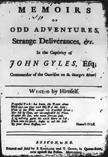 - ↑ John Gyles (1736). Memoirs of Odd Adventures, Strange Deliverances, &c. in the Captivity of John Gyles, Esq; Commander of the Garrison on St. George's River. S. Kneeland and T. Green, in Queen-Street, over against the prison. Retrieved 25 October 2012.