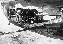 During this time thousands of rounds of ammunition exploded in all directions and he was almost blinded by the intense heat and fumes, but had the presence of mind to obtain relief by turning on his oxygen supply. Air admitted through the large holes caused by the projectile made the bomb compartment an inferno and all the aluminium sheet metal on the floor of this airman's cockpit was melted away, leaving only the cross bearers.