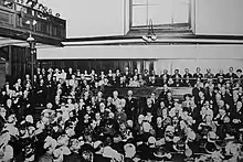 The occasion was recorded in the New York Evening Post: "At the Guildhall Court, one of two police courts of the City of London, at which the presiding judge is always one of the city aldermen... the defendants in the case were prominent Quakers, and the body of the court contained a large number of Quakers. Then the magistrate retired to consider his decision and the Clerk, of the Yearly Meeting, John Henry Barlow, rose and invited Friends who were present to engage in silent prayer. For a time, the court then became a Quaker meeting, during which the silence was occasionally broken by a few words of vocal prayer. As one of the reporters present remarked: 'It was like a throw back to the 17th century.' The incident was not only curious in itself, but is likely to be historic. Future historians may record it as a landmark in the relation of the British churches to the State. It is probably the first occasion since the Stuart period on which an organized religious body has deliberately challenged the State's authority."[11]