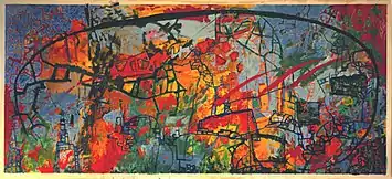 The "Meeting" series featured large-scale brush drawings, prints and paintings (up to seven-and-a-half by thirty-two feet) that intensified Himmelfarb's use of overall patterning, but developed a more dramatic narrative focus sometimes suggesting enlarged, elaborated details from the earlier drawings.[29] Most often these works, such as Lava Flow (Meeting) Red (1986) or Lumber Street Meeting (1988), depicted a pair or trio of grotesque, totemic heads (usually a man in frontal and profile views and a snarling dog), rendered in choppy interlaced brushstrokes and searing colors against black, that emerged and disappeared out of writhing vegetation.[6][15] While some critics detected the strain of "divided alter-egos" in the new work,[30] others like Art in America’s Frederick Ted Castle saw "baroque brashness," engaging "human messiness" and a rich play of dualities: representation versus non-representation, confrontation versus resolution, man versus nature/beast, the integrated personality versus its parts.[6][24][15] Andy Argy noted an intriguing play between form and image "suggesting a calligraphic version of an Abstract Expressionist gone haywire" that enabled the work to seem both serenely decorative and intensely expressionistic, and like Grimm or Andersen fairy tales, both humorous and scary.[10]