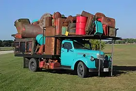 Himmelfarb initially focused on two-dimensional works that bore the influence of Dubuffet and Guston.[44][21] But a 2007 residency at the Kohler Arts Center "Arts in Industry" program enabled Himmelfarb to seriously explore three-dimensional work.[8] He began casting molten-like, expressionistic trucks that were sometimes indistinguishable from their freight, such as Greek Opera and Bird in Hand.[40][8] In 2008, he made a huge leap, acquiring a 1946 International KB-1 pickup truck, along with a host of found objects—steel barrels, equipment, tools, pipes—that he welded together and painted stop-sign red to create the assemblage, Conversion. He followed with Galatea (2010), a work more essential in its forms and drivable, and later, with the widely traveled Penelope Awaiting Her Chamberlain (2013), a mobile work using a 1946 Chevrolet farm truck that references the mythological Penelope and assemblage sculptor John Chamberlain.[40] Despite their more literal references, Himmelfarb's "Trucks" function much like his other work, freely shifting from familiar to strange, functional to artistic, industrial to whimsical, with the trucks serving largely as "carriers" of form (colors and shapes) and meaning (stand-ins representing human qualities reflected in titles such as Charity, Dedication, or Forbearance).[40][42]