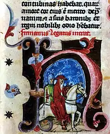 Because of Bicskei's resistance and political isolation, John became de facto head of the Hungarian Catholic Church until his death.[37] Following Bicskei's departure, all vice-chancellors of the realm, considering the proteges of John, came from dioceses belonging to the supremacy of Kalocsa. In response to Bicskei's actions and Pope Boniface's support for the Capetian House of Anjou, John and his fellow bishops initiated the convocation of the 1298 national diet, which, excluding the participation of Andrew III and the barons of the realm, proved to be a watershed in the constitutional system of Hungary and the formation of the parliamentary system.[36] During the diet, Andrew's maternal uncle, Albertino Morosini was granted Hungarian nobility.[38] The phrase "universitas regni", which first appears in the final act, implies that the participants of the national diet summed up the community of the kingdom as a whole.[39] One of the (23rd) articles of the 1298 diet established a four-member lesser council within the royal council, consisting of two nobles (representatives of the "nobility with uniform status") and two prelates (suffragans each belonging to the archdioceses of Esztergom and Kalocsa) with a three-month term.[40] One of the noble councilors was Thomas Hont-Pázmány, Archbishop John's brother, despite his magnate of origin, which reflects the influence of their clan over the royal court.[41] Their veto power prevented Bicskei from sabotaging the operation of the royal council, which resulted his total isolation in the state government, despite his nominal leading position in the royal council. John and the prelates had a virtually exclusive right to elect the four council members; both Thomas Hont-Pázmány and Henry Balog were considered supporters of the Hungarian clergy.[40] Several other articles of the national diet provided rights for John and the prelates to review the king's decisions and extended the right to ecclesiastical sanction against the barons and even the king, in order to defend Church interests and property. The articles emphasized the authority of the archbishop of Kalocsa, which confirmed John's status as head of the Church in Hungary.[42] Although Bicskei unsuccessfully attempt to shift the prelates from supporting Andrew, but the king' confidence in the Hungarian clergy was shaken due to his activity and the subsequent pro-prelate resolutions of the 1298 diet, as a result he shortly entered into a formal alliance with five influential barons, including Amadeus Aba and Stephen Ákos, who stated that they were willing to support him against the Pope and the bishops. Seeing the increased influence of John at the expense of royal authority, Andrew did not want to rely solely on the bishops during his reign.[43]