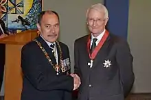 Hood (right) in 2014, after his investiture as a Knight Companion of the New Zealand Order of Merit by the governor-general, Sir Jerry Mateparae