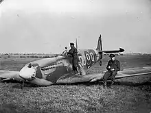 On 27 August, flying a Spitfire Mk IX, Houlton destroyed a Focke Wulf Fw 190 fighter over St Pol.[1] The next month he shared in the destruction of another Fw 190 and also damaged a Messerschmitt Bf 109 fighter.[1] He received a further promotion in September, to flying officer.[9] The squadron had a period of reduced operations in Scotland with No. 12 Group over the winter period before returning to the south of England in February as part of the RAF's Second Tactical Air Force. The 2nd TAF had been raised to provide air cover protection and support during the operations of the Second British Army and the First Canadian Army during the impending invasion of France. Accordingly, it began training in the appropriate tactics, including operating in a fighter-bomber role. The squadron returned to operations in March, carrying out bomber escorts and sweeps to France.[10]