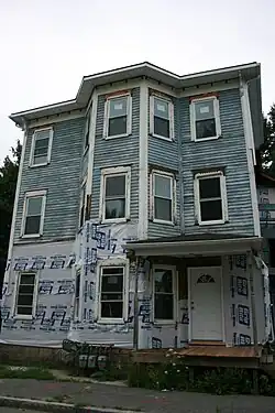 The John Johnson Three-Decker is located on a residential street in eastern Worcester, on the west side of Eastern Avenue north of Belmont Avenue (Massachusetts Route 9, a major through road). It is a three-story frame structure, covered by hip roof with decorative brackets in it eaves. The walls are finished in wooden clapboards. The facade of the building is unusual for triple deckers built in Worcester, with three bays, of which the center one is a projecting polygonal window bay. The main entrance is in the right bay, sheltered by a hip-roofed porch. When listed on the National Register of Historic Places in 1990, the porch had turned balusters and supports,[2] features that have since been removed.